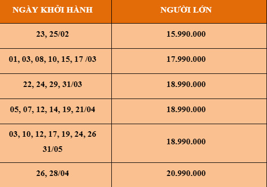 (Đơn giá áp dụng cho khách lẻ, ghép đoàn từ 30 người lớn trở lên)