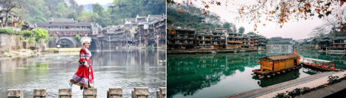 Chiều: Hướng dẫn viên đưa đoàn đi tham quan Phượng Hoàng Cổ Trấn với lầu Miêu Miêu, Bắc Môn cổ thành, Lầu phong Thúy Hồng Kiều, Viện Bảo Tàng Cổ Thành (tham quan bên ngoài), tháp Vạn Danh. Khám phá vẻ đẹp từ những viên đá cũ kĩ của tường thành đến những mái ngói xô nghiêng, mộc mạc giản dị với những con thuyền và người lái đò lặng trôi trên dòng Đà giang xanh màu ngọc bích tới những xúc cảm da diết lắng đọng như muốn níu giữ những chiếc lá vàng óng lững lờ trôi qua. Cảm giác được thưởng ngoạn từ cầu Hồng Kiều phóng tầm mắt ngắm trọn dòng Đà giang như khi xưa vua chúa hay trộm nhìn mỹ nữ tắm dễ làm ta tức cảnh sinh tình. Con người nơi đây ngàn đời gắn trọn với bao đổi thay của đất trời thời đại, với bao nét văn hóa ngoại lai giao thoa mỗi ngày đã tạo lên điều huyền bí và lung linh như Phong Hoa.