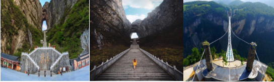- Thiên Môn Sơn: Quý khách sẽ đi theo con đường bao quanh những đỉnh núi, xuyên từ đỉnh núi này sang đỉnh núi khác. Một bên là núi, một bên là mây, thỉnh thoảng có thêm những lá bùa may mắn màu đỏ rực rỡ sẽ khiến quý khách cảm thấy lạc như lạc vào chốn bồng lai tiên cảnh, như đang đi trên 9 tầng mây của thiên đường. Ngọn núi nổi tiếng với con đường trên trời và hệ thống cáp treo dài hơn 7,4km tại Thiên Môn, được tuyên bố trong các ấn phẩm du lịch là “cáp treo dài nhất tại một ngọn núi cao nhất trên thế giới”. Quý khách trải nghiệm cáp treo 2 chiều.