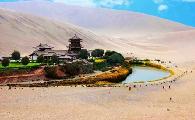 Hồ Nguyệt Nha Tuyền đặc biệt bởi vì nó nằm giữa sa mạc Gobi, thuộc tỉnh Cam Túc, hồ nước giữa sa mạc này là một cảnh đẹp do thiên nhiên ban tặng cho nơi đây. Nếu như không tận mắt tới đây chứng kiến khung cảnh này thì có thể nhầm đây là hình ảnh được chỉnh sửa, nhưng không, nó hoàn toàn tồn tại ở Trung Quốc.